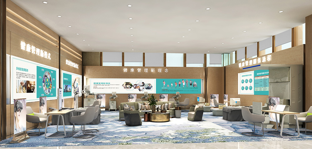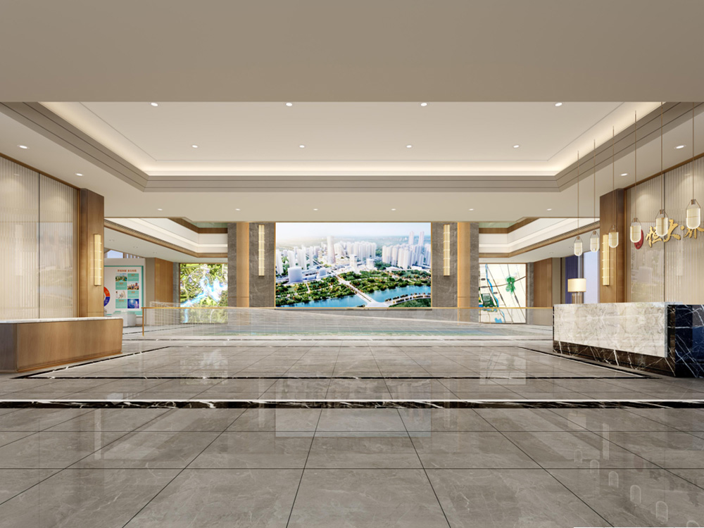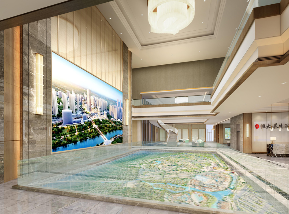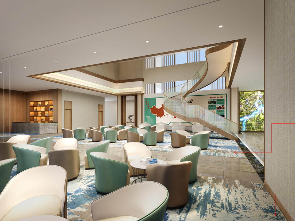 設計說明:銷售中心分為營銷大廳、接待區、3D影音室、9A工法展示區、兒童游樂區、簽約區、會議室七大功能分區;天花與地面形大理石材質互相呼應,讓人感受營銷大廳空間的高貴與大氣;雙旋轉樓梯圍繞著沙盤,彰顯了銷售中心霸氣的設計;就像9A工法展示區的蒂芙尼藍的與眾不同,秉承始終如一和精準悉心打造,從設計到施工到入住打造一個環境優美并安全的入住空間;兒童游樂區的貼心設計,讓用戶在購房的過程中能安心無憂的接收樓盤信息,對于兒童來說是一個新的游樂環境。